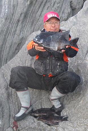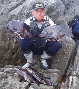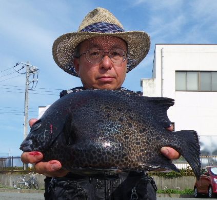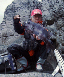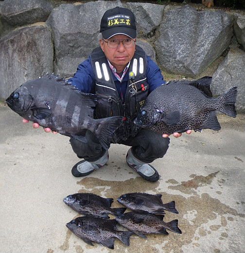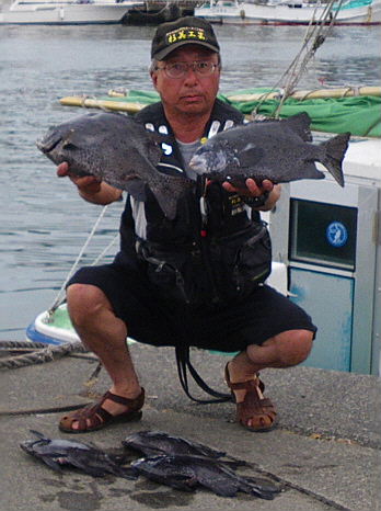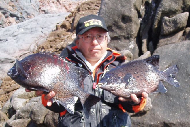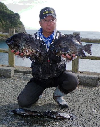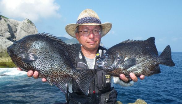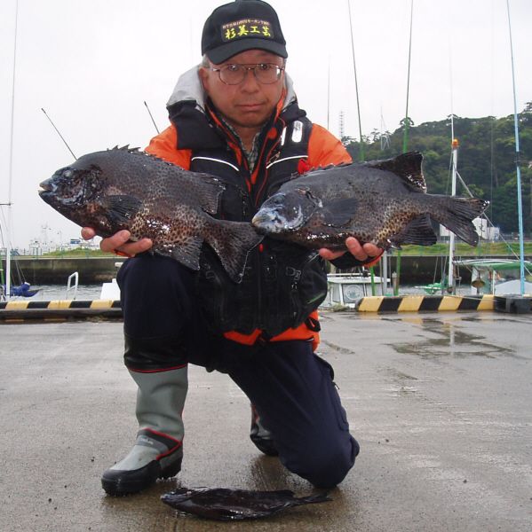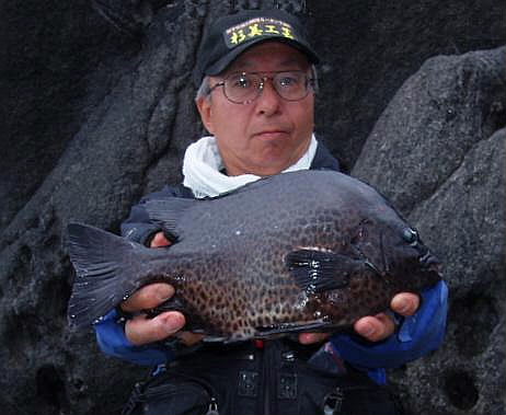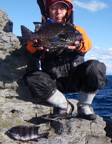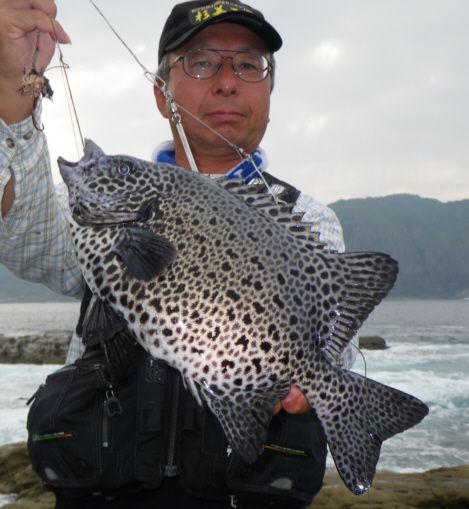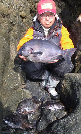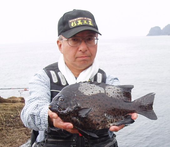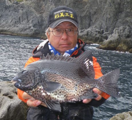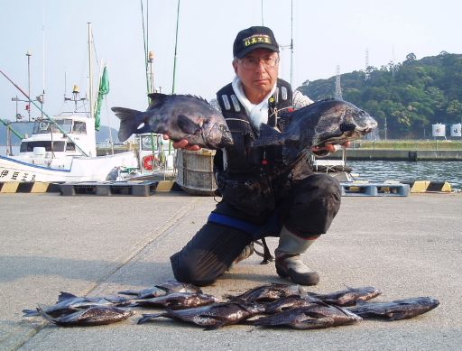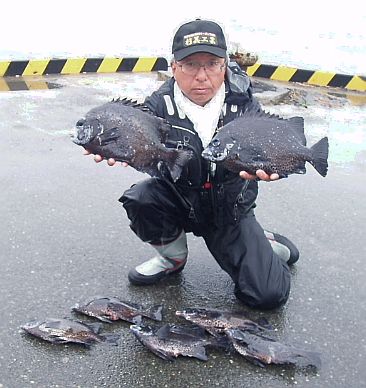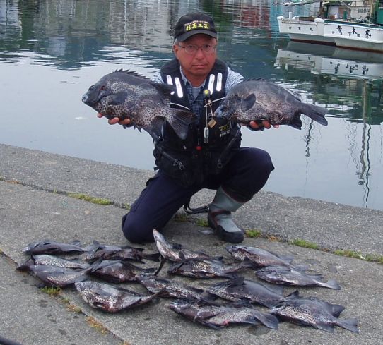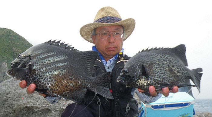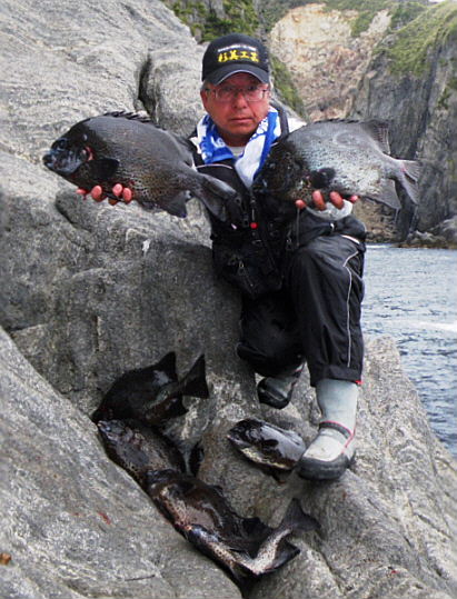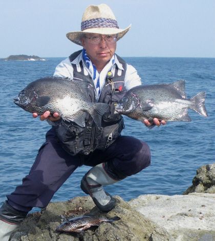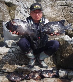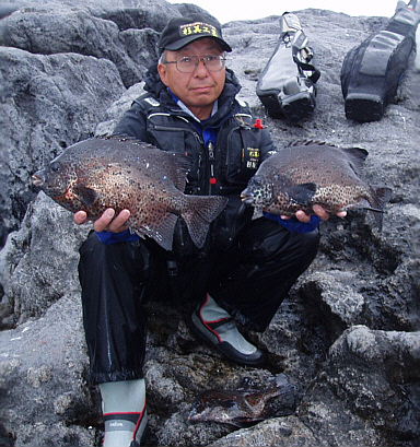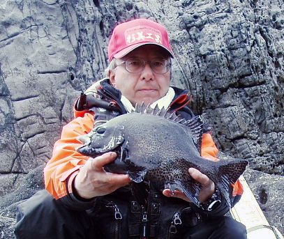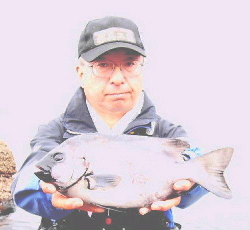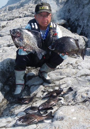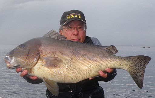 水温が15度前後と非常に低い中,神津島の二八の磯に乗ることができました。エサは,ヤドカリとウニの両方を持っていきました。コマセのウニガラを入れ,当たりを待ちましたが,エサトリもない状態でした。11時頃,よい潮が入るようになりました。そこで,海底は竿先から39mありましたが,手前の駆け上がりを狙うことにし,海底から5m程上に仕掛けを止めました。すると,すぐにどっしりした当たりがあり,数回竿が絞り込まれたところで合わせました。重い手ごたえが竿に伝わり,しばらくすると水面に大型の本イシが姿を現しました。53cmのメスでした。その後は全く当たりがなく,午後1時を過ぎたころ,2回目の当たりがあり,39cmの口が白くなったワサを釣ることができました。どちらもウニで食ってきました。竿は,『秀竜』を使い,その食い込みのよさと竿のしなりのすばらしさを堪能することができました。これで今年の釣果は,計2枚となりました。100枚を目指してがんばります。