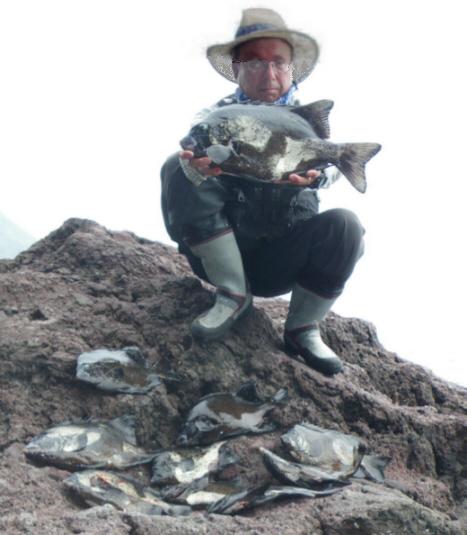 台風3号が接近し、神津島に釣行できるか心配していたのですが、ウネリはなく、しかも、船長の計らいで運よく銭洲に釣行することができました。銭洲に着いてみると、海はべた凪で、これまでの銭洲釣行では、遠くからしか見ることができなかった憧れの磯である大ダルマ、小ダルマを直接、見ることができ、感動していました。すると、船長が、「杉坂さん、乗るか?」と聞いてきました。すぐさま返事をし、何と、大ダルマに乗ってしまったのです。一生に一度しかないチャンスと思い、竿を出しながらも、本当に今、大ダルマいるんだという感動を味わいながら、この幸運に感謝をしました。竿を出してみると、右からの潮が早くて、50号の錘では全く止まらないことがわかりました。そこで、50号の錘を2個つけ、仕掛けを竿下に落ち着けました。するとすに当たりがあり、竿が舞い込みました。44cmの本イシでした。さらに、45cmのワサを釣り、またまた41の本イシを釣りました。入れ食い状態です。何と、3時間の間に40cmから48cmの本イシやワサを10枚以上釣り、40cm以下はすべてリリースする状態でした。しかし、昼近くになると、潮がさらに速くなり、当たりが少なくなりましたが、午後1時半の納竿までには、40cm以上の本イシを3枚、ワサをを9枚、計12枚釣ることができました。リリースした数を含めれば、20枚以上を釣ることができ、大ダルマのすばらしさを堪能することができました。これで、今年の釣果は、計22枚になりました。