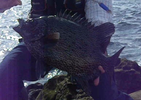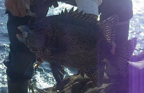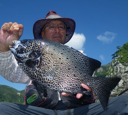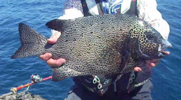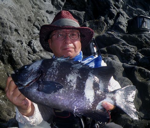 ゴールデンウィークの初日,神津島へ釣行し,運よく,陸の作根のチョンボリに乗ることができました。そこは,畳1枚ほどのスペースしかない場所で,激流が足下にゴウゴウと流れ,さらに時々波が足元を洗う状況でしたが,船長が,潮が上げてくる11時まではできるだろうと下してくれました。チャヤンボを立て,道具をロープで縛りつけて,竿をセットし準備完了。18号の針にヤドカリをつけ,ようやくの第1投目を潮上20mに入れました。仕掛けは,すぐに足下のケンミで止まりました。そこで糸ふけをとって,竿をセットすると,すぐにゴンゴンという強い当たりがありました。そして,竿が舞い込みました。そこで,リールのストッパーをはずし,糸を出しながら竿を手持ちに代え,次にストッパーをかけると,ゴンゴンという当たりが帰ってきました。そして,引き込みに合わせて竿先を繰っていると,強烈な引き込みが伝わってきました。思いっきり合わせると,強烈な締め込みがやってきました。膝を曲げて耐え,リールを巻き続けると,水面に顔を出したのは,中型の口白でした。図ってみると,48cm,2.2kgでした。その後は,11時までに,40cm〜45cm前後のワサを3枚,釣ることができました。そして,船が迎えに来てくれ,タタキ根に場所替えしました。そこでは,のんびりと釣りができ,エサをウニに変え,40cmのワサを2枚,釣ることができました。戦いの釣りも,のんびりの釣りも楽しいものです。これで,今年の釣果は計8枚となりました。