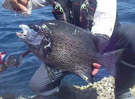 いよいよ秋磯の本番を迎え,大型クチジロが期待できる神津島に釣行し,本島の離れ磯のトウフに乗ることができました。この磯は,名前の通り,豆腐のような形をしており,棚も17m,20m,25m,27m,30m,35mと段々になっており,根がかりの少ない磯です。潮は,緩い潮が右から差し,絶好の条件になっていました。コマセのウニ柄を入れ,餌にヤドカリを付けて入れるとすぐに当たりがあり,2投目で43cmのワサを釣ることができました。その後も当たりが続くのですが,大型狙いで針が18号と大きいため,なかなか乗らず,船長の見回りまでには,同型3枚の釣果でした。11時を過ぎたころからは,潮が遅くなり,ガンガゼやマガニでは食わなくなりました。そこで,再びヤドカリに代えてみると,強い当たりが出始め,45cmと47cmの2sのワサを2枚,釣ることができました。しかし,大型は出ませんでした。これで,今年の釣果は計101枚となりました。