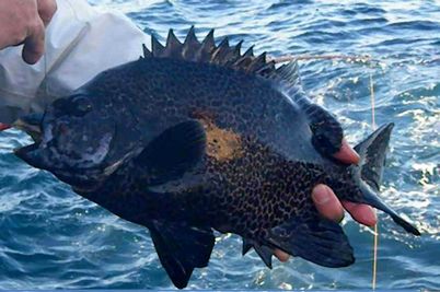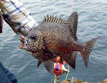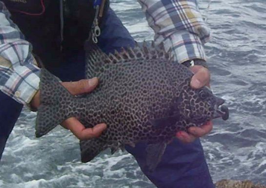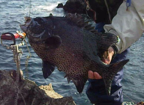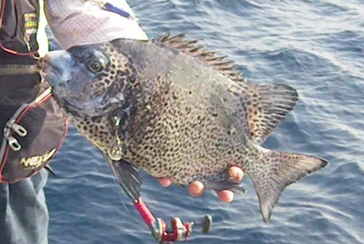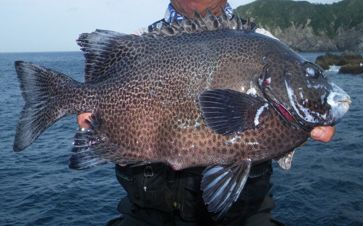 大物ラッシュでにぎわう神津島へ釣行し,タダナエ群島のオネイモに乗ることができました。激流が沖に向かって左から右に流れ,錘を止めるのが一苦労でした。ヤドカリを使ってもエサ取りの当たりがあるだけで,ウニでは,ほとんど食わない状況が続きました。しかし,10時30分ころになると,潮の動きが弱くなり,30m前後の深場を狙えるようになりました。すると,しっかりした当たりがあり,40cm1.5kgのワサを釣ることができました。そして,さらに潮が緩み,正面から当たるようになったので,35mの棚を狙ったところ,重いドッシリとした当たりがあり,ゆっくりと穂先が引き込まれました。そこで,道糸を送って,テンションを緩めて当たりを待ちました。すると,次の瞬間,竿が根元まで舞い込みました。しっかり合わせを入れると,強烈な閉め込みがありました。竿を立てて応戦し,根に入られないように,ポンピングを繰り返しました。そしてようやく顔を出したのは,口白の雌でした。計量してみると,56cm,3.5kgありました。よく太っていました。これで,今年の釣果の計は,16枚になりました。