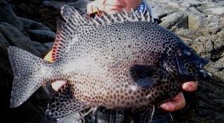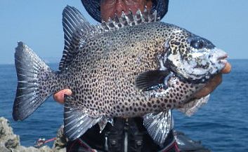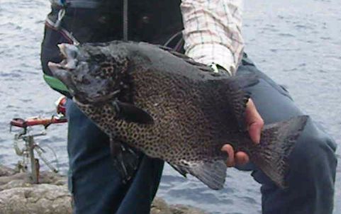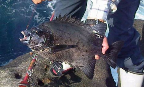 神津島に黒潮が直接当たる好条件の下,大型のクチジロが連続して出ている超一級磯のカツオアサラに乗ることができました。潮は,オンバセのカド方向から激流が差しおり,竿は硬調胴調子の「輝竜」を使うことにしました。やはり,低い磯のポイントでは,50号の錘があったという間に流されてしまいました。そこで,仕掛けを右下の隠れ根で止められるよう磯際ぎりぎりの15m程潮上に投げ,ポイントに落ち着いたところで糸ふけをとり,当たりを待ちました。エサは,ヤドカリを使ったのですが,小さなエサ取りにきれいに食われてしまう状況が3回続きました。そこで,エサをガンガゼの2個掛けに替えて同じポイントに入れてみました。すると,ガンガンと強い当たりが竿先に出た後,竿が根元まできれいに舞い込みました。思いっきり合わせると,強烈な手応えで,直ぐに竿を立てることができませんでした。そこで体重を後ろに掛け,やっと竿を起こすことができました。後は,隠れ根に潜られないよう強いポンピングを繰り返しました。そして,ようやく海面に顔を現わしたのは,大型のクチジロでした。18号の針がしっかりとカンヌキに掛かっていましたので安心し,無事,取り込むことができました。計量してみると,67cm,5.4kgありました。その後は,3.2kg,1.1kg,1.5kg,2.2kgを追加し,納竿となりました。感動の1日になりました。これで,今年は,計9枚の釣果となりました。