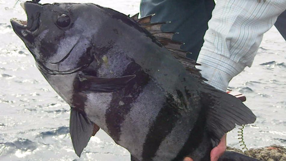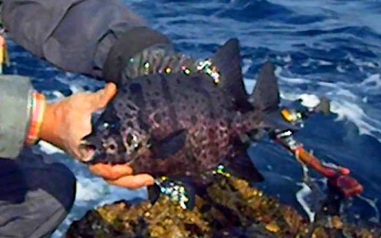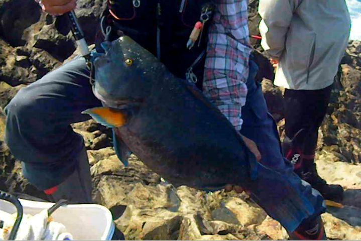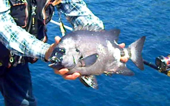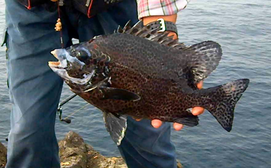 ● 伊豆・神津島釣行 2013. 3. 20 今年は,神津島の水温の上昇が早く,3月に入ると18度を超えるようになりました。そこで,ヤドカリが手に入ったので,早春の神津島に釣行し,横 瀬のギボにのることができました。潮は,竿下に当たっており,好条件でした。しかし,餌取りもいない状態が続きました。11時を回った頃,ようやく当 たりがありましたが,根に入られてしまい,残念ながら顔を見ることができませんでした。そして,その後,すぐに当たりがありました。しかし,なかな食い 込みません。そこで,じっくりと待っていると,ようやく走りました。上がってきたのは,55cm,3.1kgの本イシのメスでした。これで,今年の釣果は,計 1枚となりました。 |