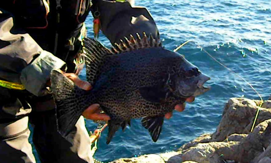 ● 伊豆・神津島 タダナエ群島 平段 釣行 2013. 5. 24 大型の本イシや口白が出る最後のチャンスと,べた凪の神津島に釣行し,タダナエ群島の平段に乗ることができました。潮は,反転流が当たっている状態でした。コマセを入れ,竿を入れると,小さなイシガキダイが食ってくるのが分かり,ガンガゼやヤドカリがあっという間になくなる状態でした。昼近くになっても同じ状態でした。しかし,午後1時頃からようやく足元に潮が差すようになり,綺麗に竿が舞い込みました。上がってきたのは,38cm,1.3kgのワサでした。その後は,同型を3枚釣り,最後に上がってきたのは,42cm,2kgのワサでした。いよいよ夏磯の始まりです。次に大型が出るのは,秋磯になってからでしょう。これで,今年の釣果は計8枚となりました。 |