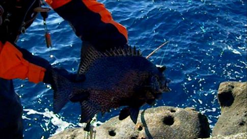 ● 伊豆諸島・イナンバ島釣行 2013. 6. 4 めったに行けないイナンバへ,3週間弱で,再び行けることになり,左本場に乗ることができました。しかし,潮が逆潮で,厳しい状況でした。小型のワサがカニの餌に食ってきますが,ガンガゼは残ってくる状態でした。そのような状況の中で,1kg前後のワサが2枚来て,納竿となりました。これで,今年の釣果は計12枚となりました。 |