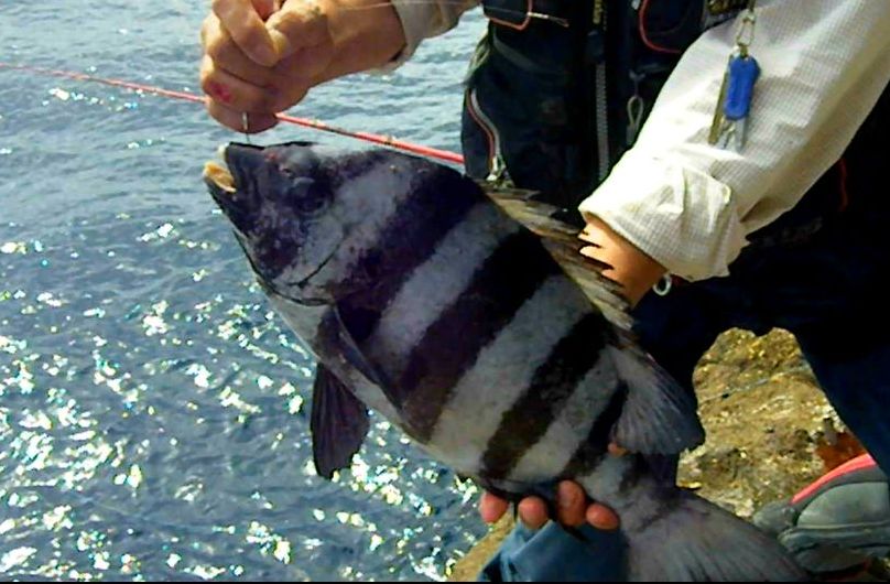 ● 伊豆・神津島 猿ヶ崎・松ヶ下・カツオアサラ 釣行 2013. 12. 2・3・4 4ヶ日間連続の釣行の3日間は,神津島に出かけ,猿ヶ崎・松ヶ下・カツオアサラに乗ることができました。どの磯でも大型のクチジロが出るチャンスはあったのですが,残念ながらイシガキダイばかりでした。しかし,カツオアサラでは,石鯛とイシガキダイの雑種であるキンダイを釣ることができました。これで,今年の釣果は計61枚となりました。 |