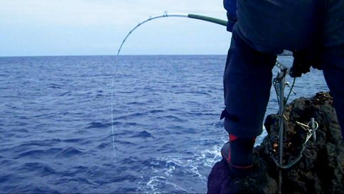 『 超剛竜(黒漆仕上げ) 』のフィールドテストで,神津島へ釣行し,岡の作根の四畳半に乗ることができました。南からの激流が差し,磯は最高の状態でした。大物がいそうな予感がしました。そこでいつものように,『W針釣法』の仕掛けを入れると,小型のワサの当たりがあります。いよいよ来るかと思っていたのですが,その当たりもだんだんと遠のき,ついに潮が止まってしまいました。納竿近くには,再び潮が動き出したのですが,ついに竿が舞い込むことはありませんでした。水温が急に下がって,また上がったようで,この変化がよくなかったようです。 |